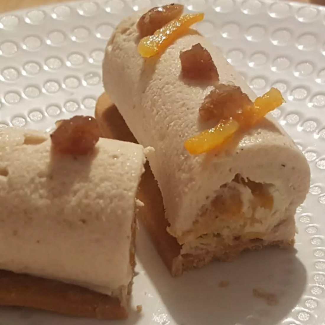 📍Biscuit sucré📍Crumble fleur de sel📍Dacquoise amande📍Marmelade de mandarine📍Suprêmes de mandarine et brisure de marron📍Chantilly📍Mousse marron