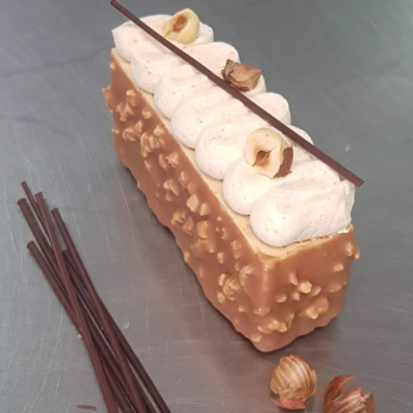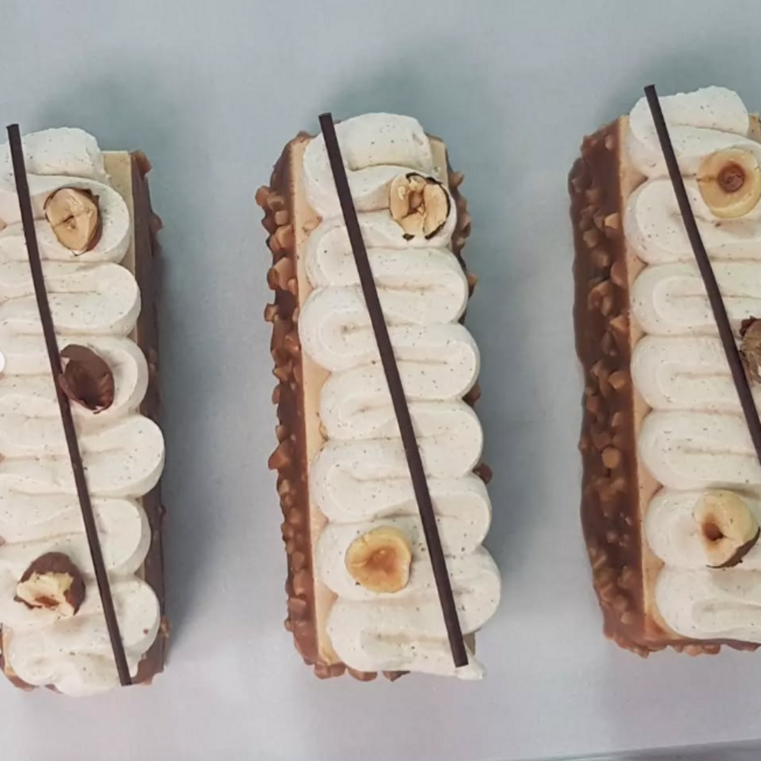 📍Pain de gènes chocolat📍Croustillant riz soufflé📍Crémeux noisette📍Crème diplomate praliné📍Glaçage gourmand📍Chantilly noisette