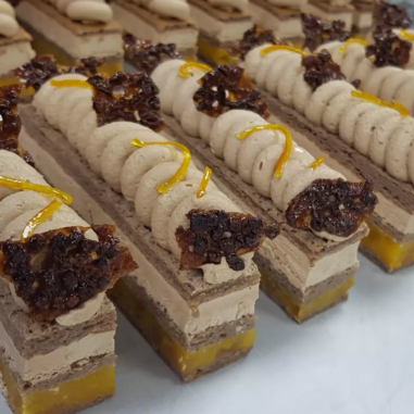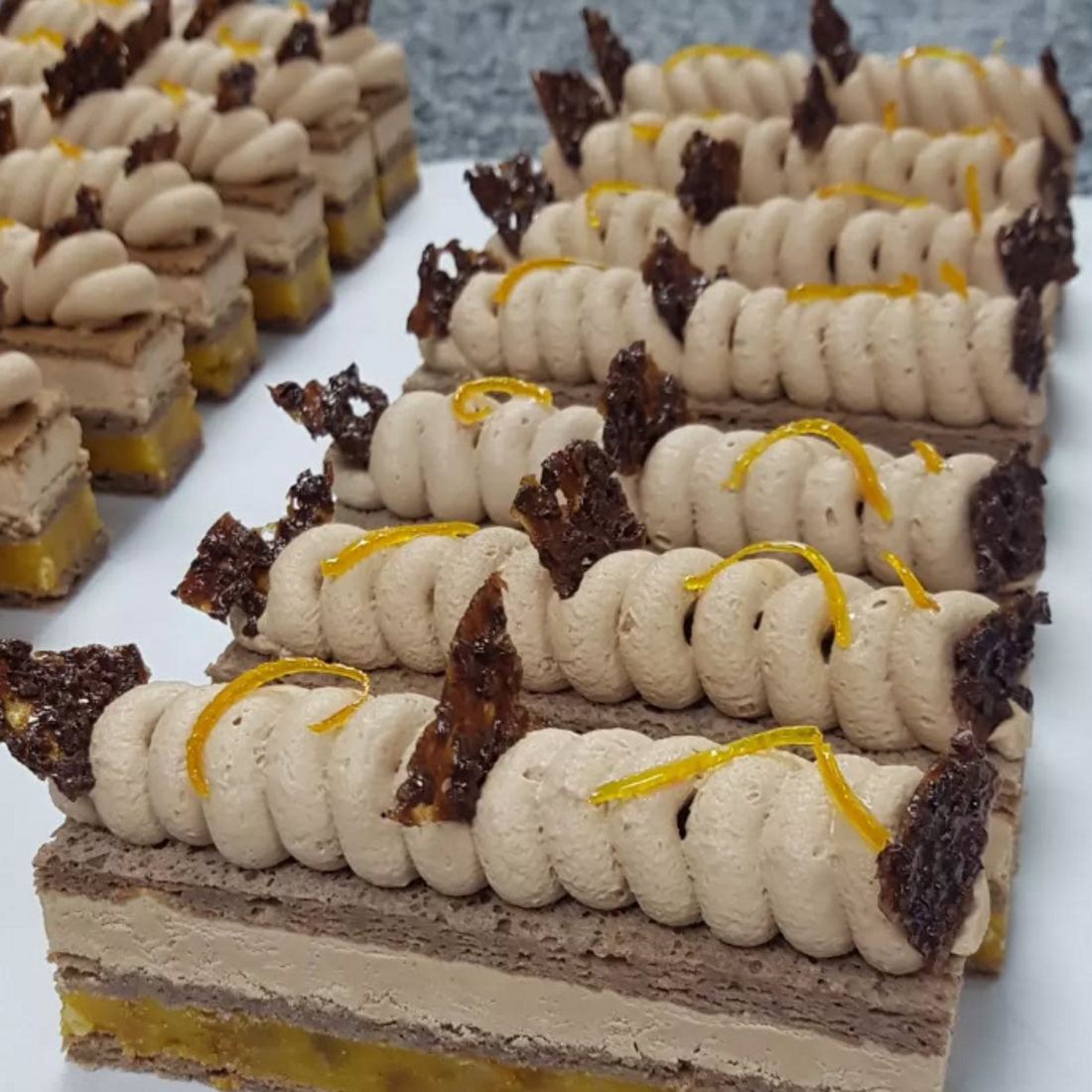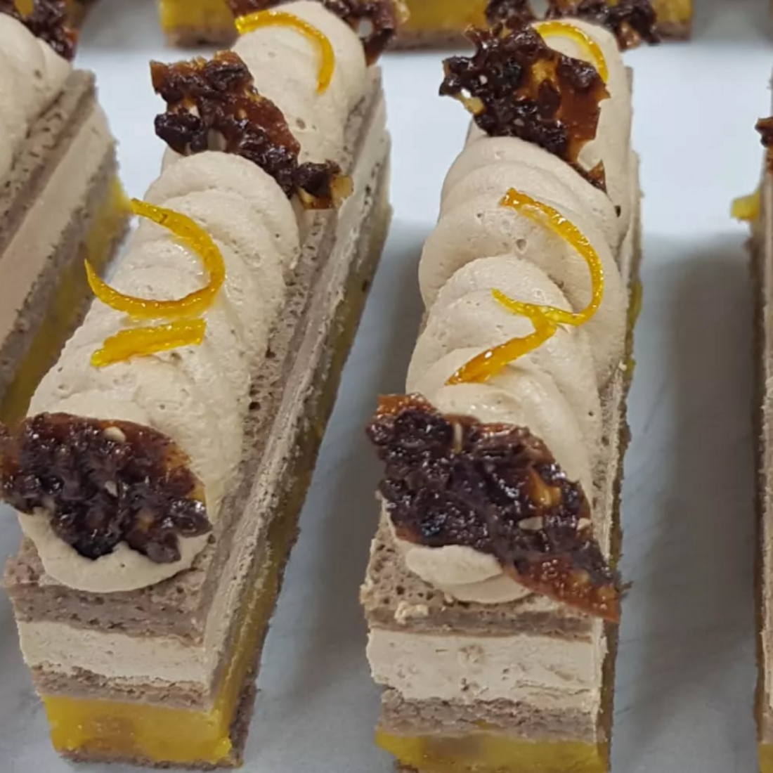 📍Biscuit Joconde📍Marmelade d'Orange📍Ganache montée Caramélia📍Tuile au grué