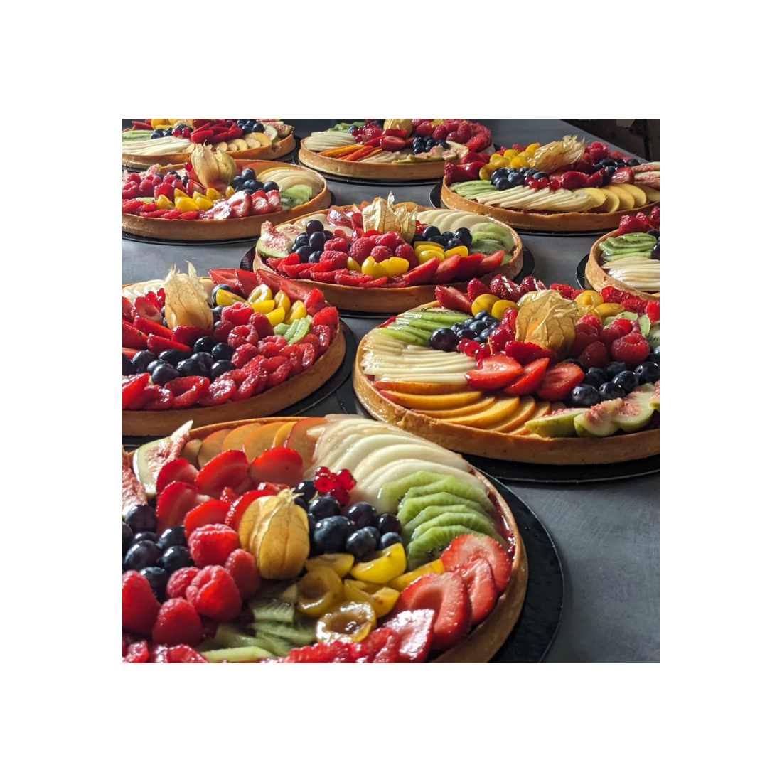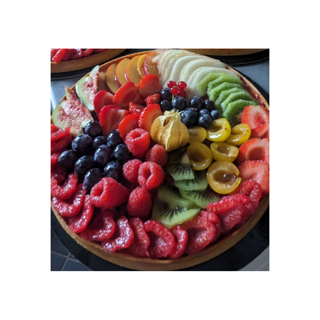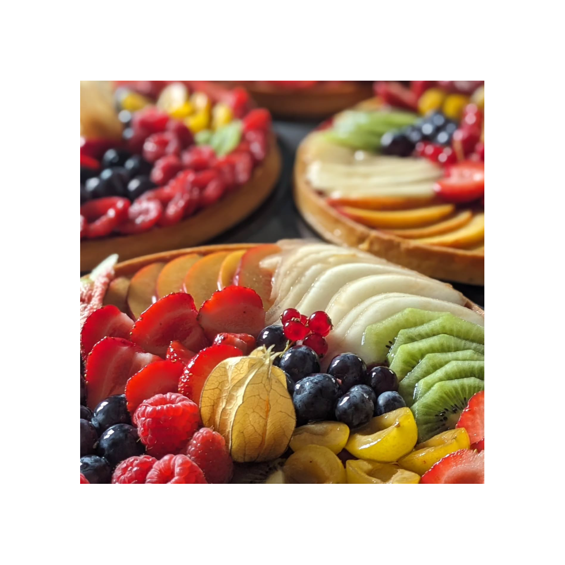 📍Pâte sucrée📍Crème d'amande📍Exemples de fruits : Poires, nectarines, fraises, framboises, figues, kiwis, mirabelles, raisin muscat, groseilles, physalis